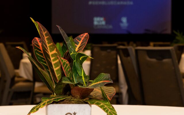 - Greenery arrangements in tall glass vases used to add dimension to the presentation room for the keynote speakers