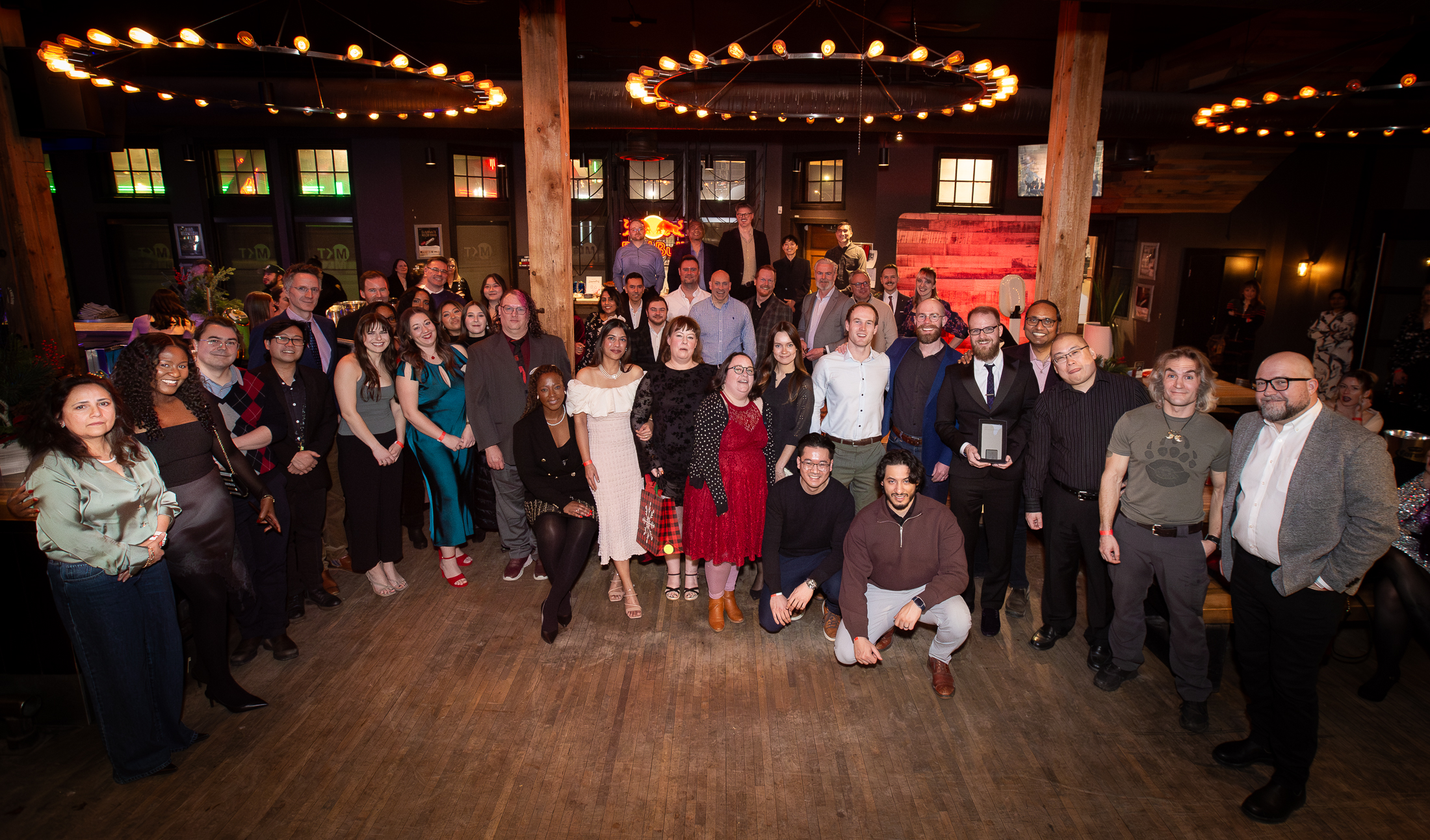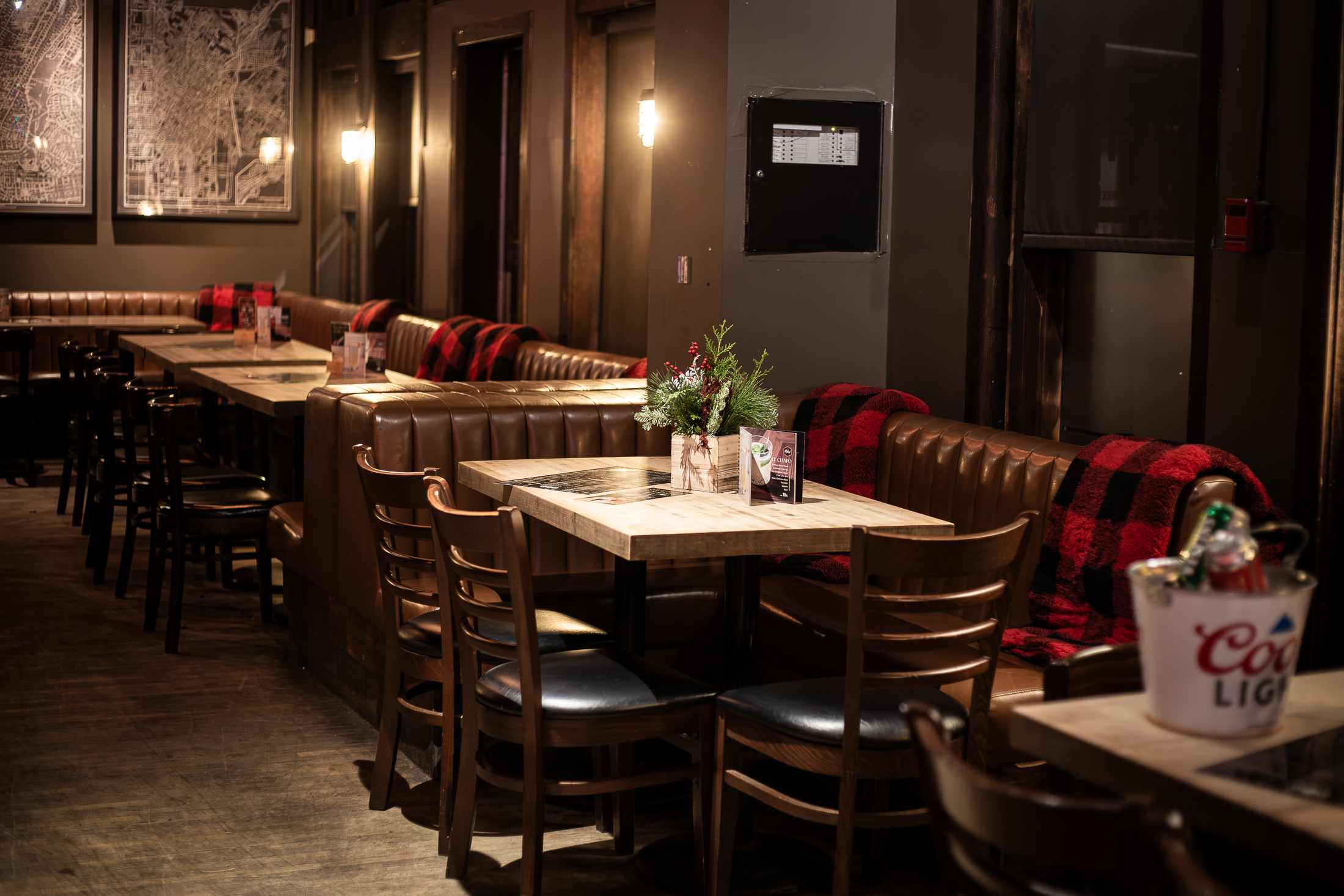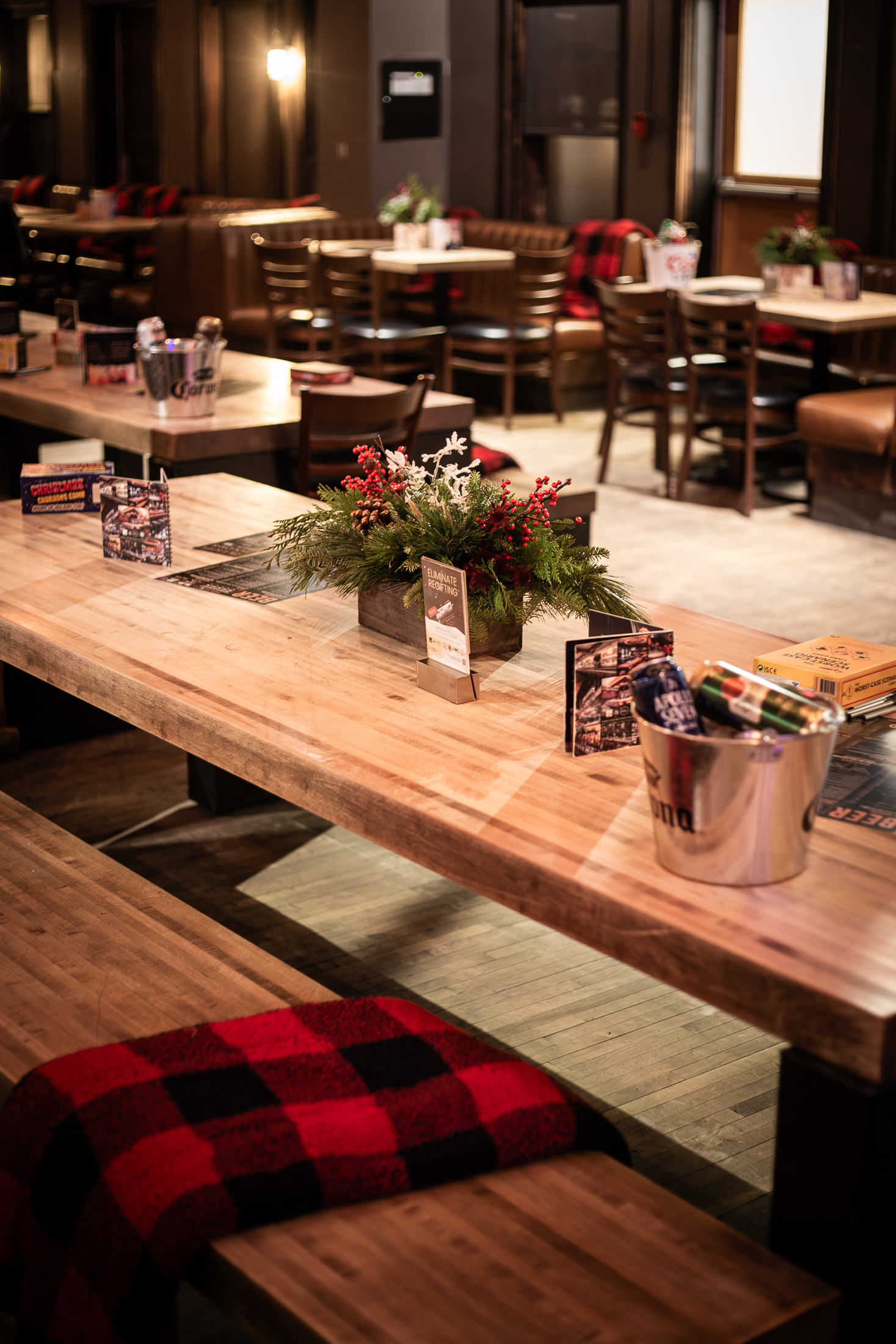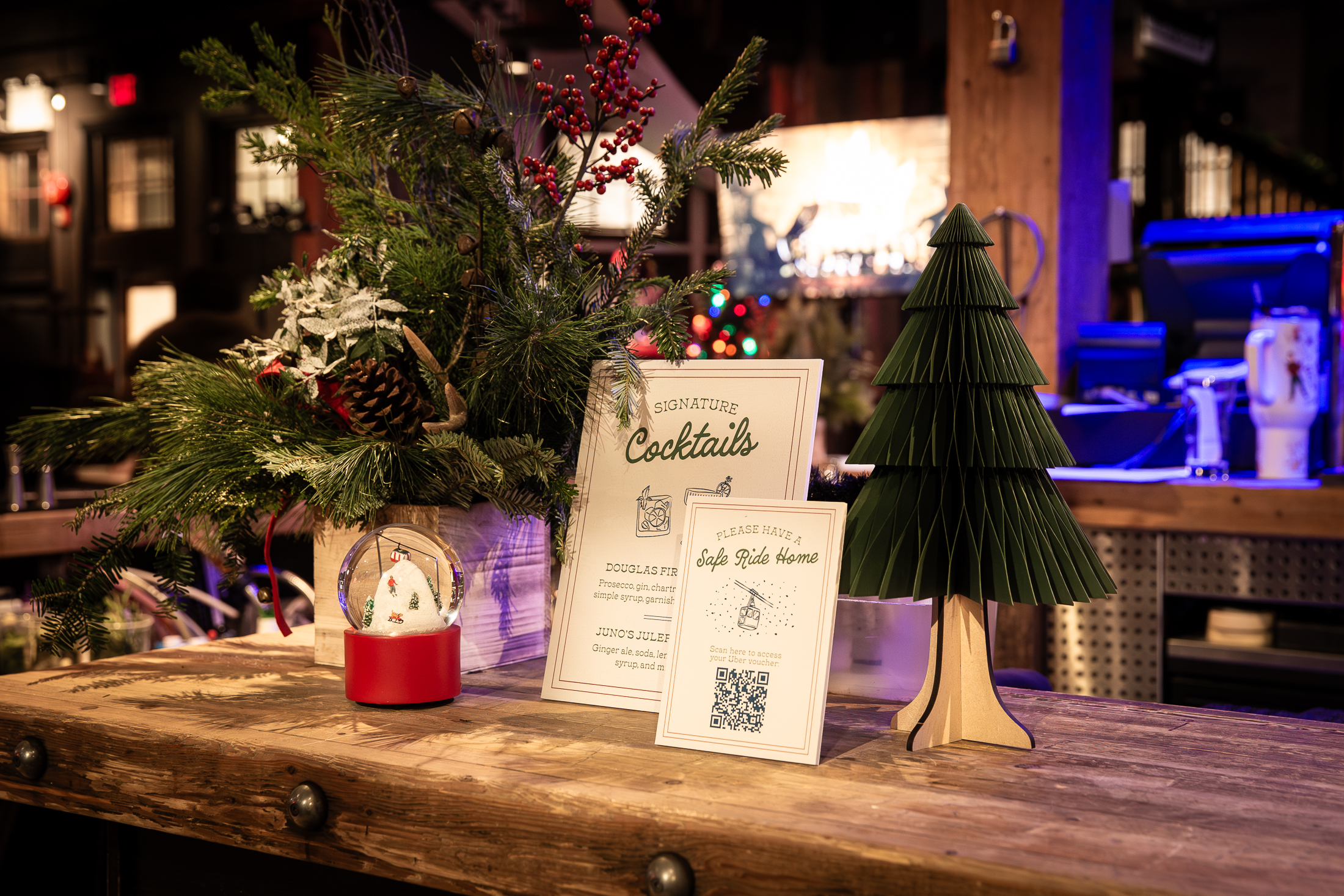 Team Tycoon transformed MKT into “The GoodMorning Apres Ski Chalet” for the company’s annual holiday staff party. Fire pits with Adirondack chairs, decorative skis, and evergreen accents provided a welcoming outdoor entrance. Once inside, GoodMorning staff and their guests were greeted with prosecco and tray-passed appetizers. Greenery and wreaths added holiday warmth throughout the space, complemented by snow globes and seasonal bar decor, with fireplace scenes playing on screens to enhance the après-ski atmosphere.