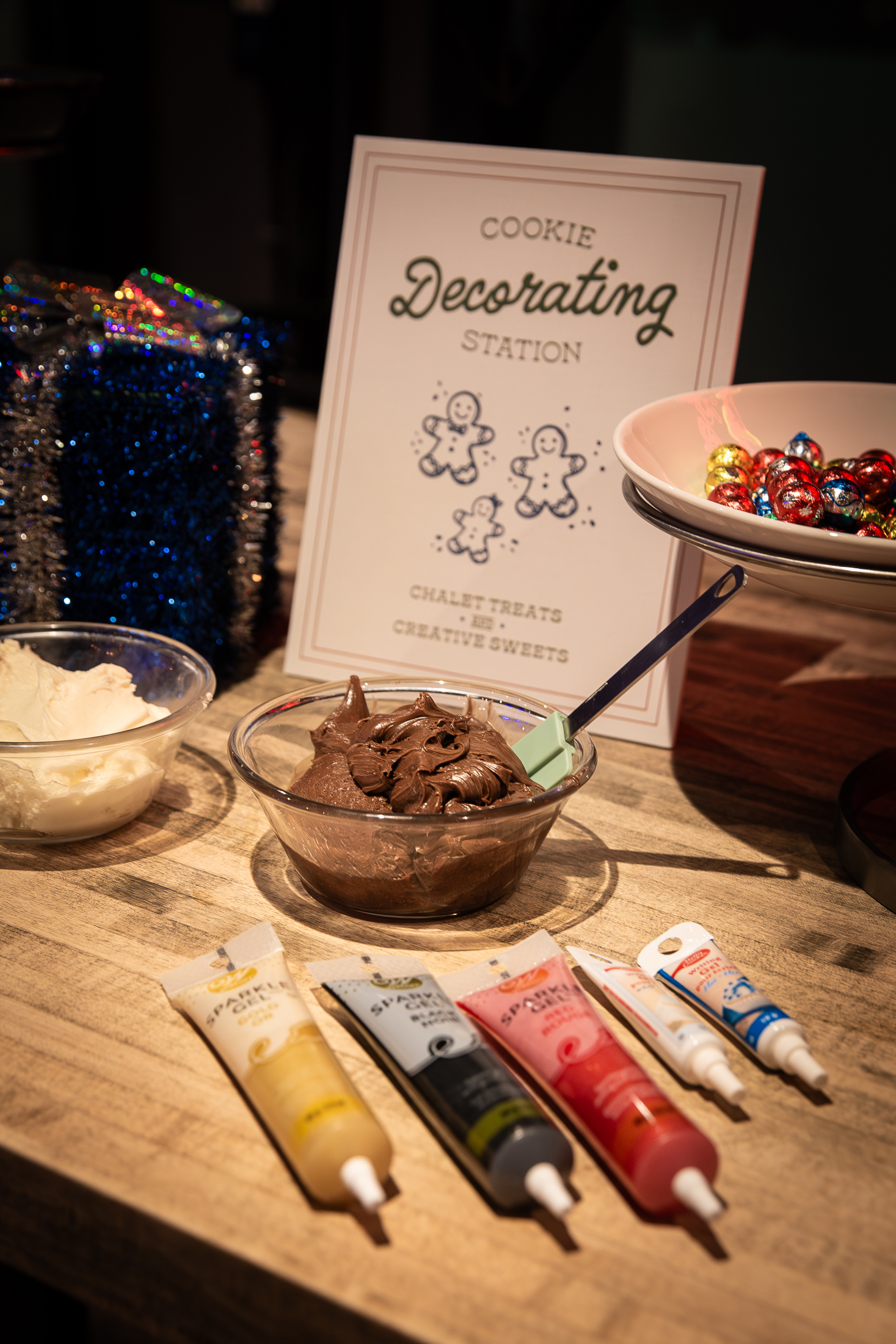 - A festive cookie decorating station invited guests to personalize sugar cookies and gingerbread cookies with an array of colorful icings and toppings.