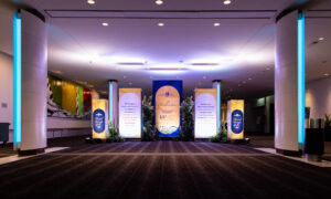 - The table centrepieces mimicked this design, with three towers at each table that contained sponsor logos, a QR code to access the silent auction items, and more.