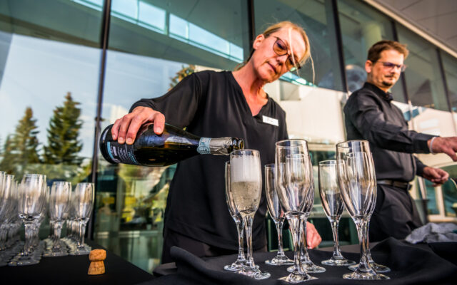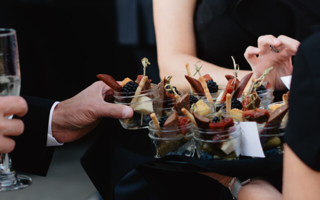 As guests arrived at the event, the entrance was flanked with ice carvings of animals found in the Arctic – the caribou and the polar bear. Each sculpture included an interesting scientific fact that pertained to each animal. Live instrumental music was also played along the walkway and lined with a red carpet. Champagne and ‘jar-cuterie’ (a fun spin on individually portioned charcuterie in a mason jar) was served to guests as they arrived.